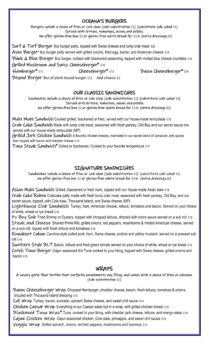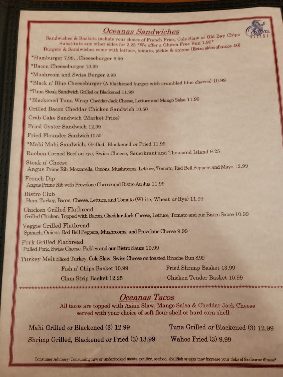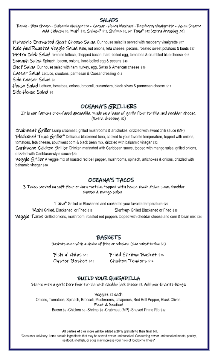 Oceanas Bistro, nestled in Avon, NC, presents a delightful array of coastal culinary treasures. The menu highlights diverse seafood offerings, such as the mouthwatering Seafood Platter featuring mahi and shrimp, celebrated for its freshness and flavor. For a unique twist, try the Crabmeat Griller, where lump crabmeat meets grilled mushrooms and artichokes, brilliantly enhanced by sweet chili sauce.